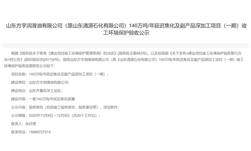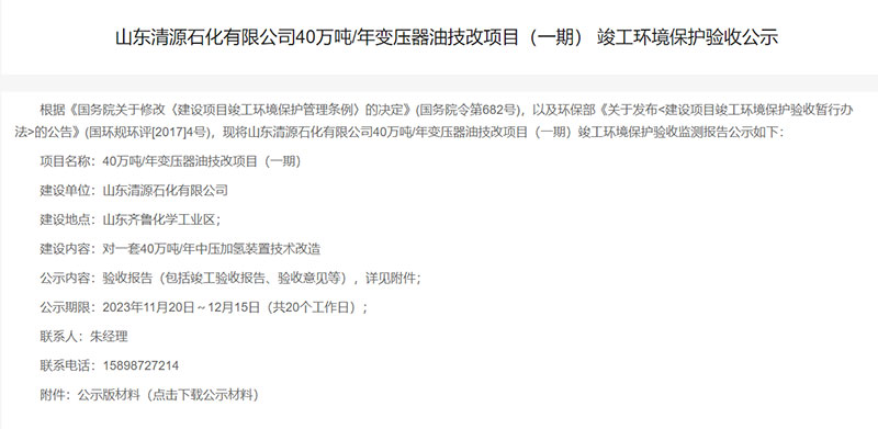 山東清源石化有限公司40萬噸/年變壓器油技改項目(一期)竣工環(huán)境保護(hù)驗(yàn)收公示